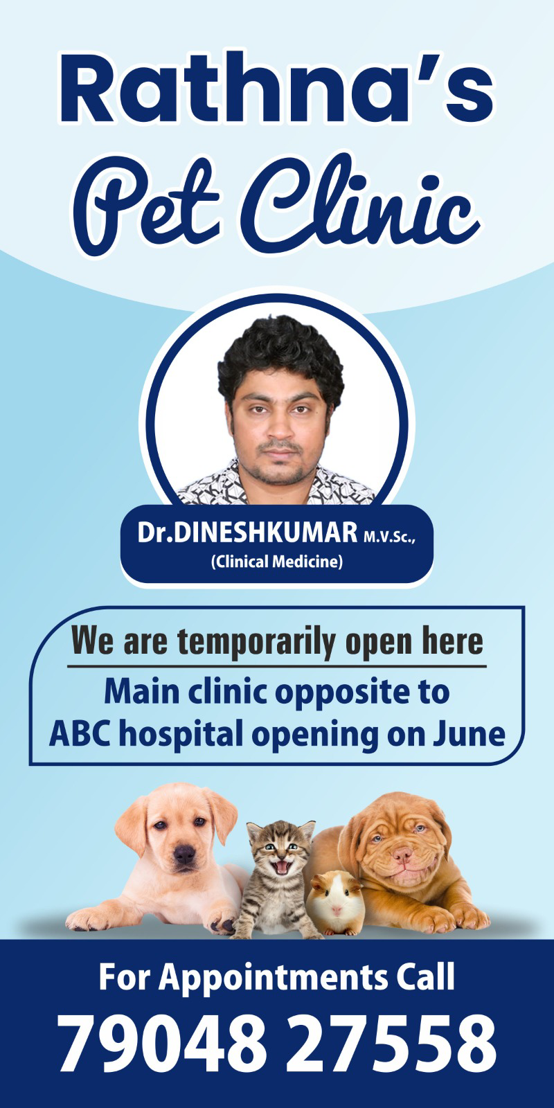 Best pet hospital in Trichy Rathna's pet clinic We are temporarily open here (opposite to Suzuki showroom) Annamalaai Nagar, our main clinic will be open from june month (opposite to ABC hospital Annamalai nagar)